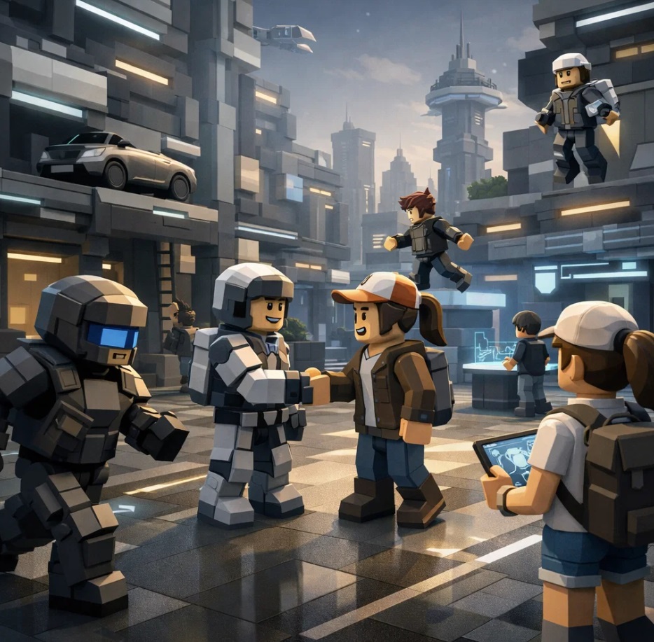 Pixelated, block-based environments inspired by Roblox and voxel aesthetics;
